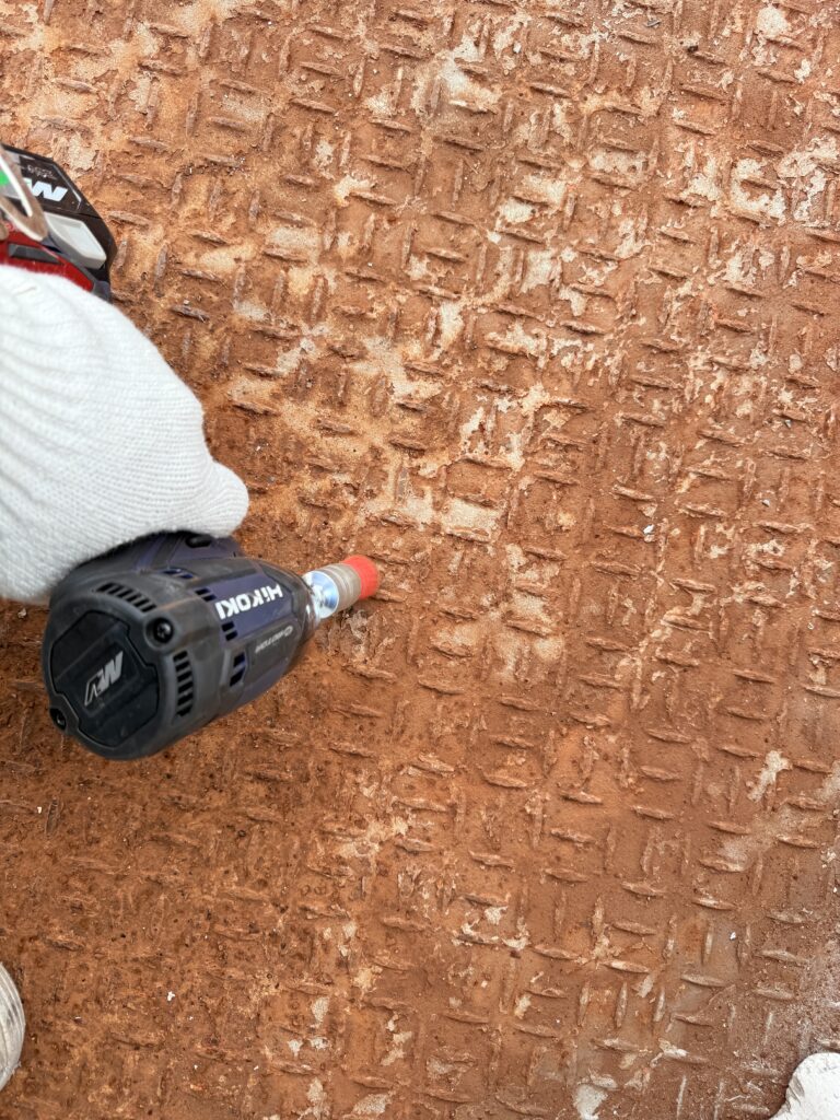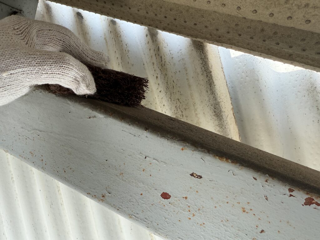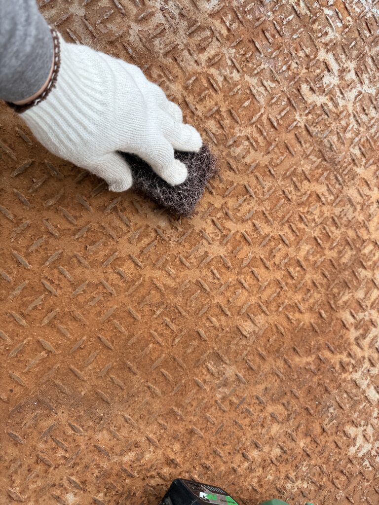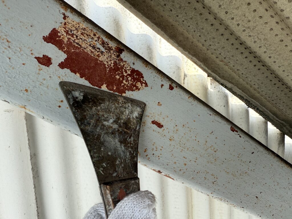 ケレンにて古い塗膜やサビ、汚れを徹底的に除去します。表面に微細な傷を付ける「目荒らし」を施すことで、塗料の密着性を格段に高めます。