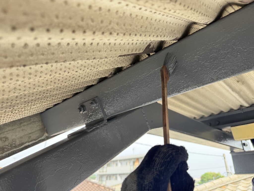 ケレン作業終了後、劣化が進行している箇所に錆止め塗料「ハイポンファインプライマーⅡ」を先行して塗布します。錆が露出している部分を塗装した後に、全体をもう一度錆止め塗装することで、錆の進行を止めると共に上塗りの密着性も高めます。