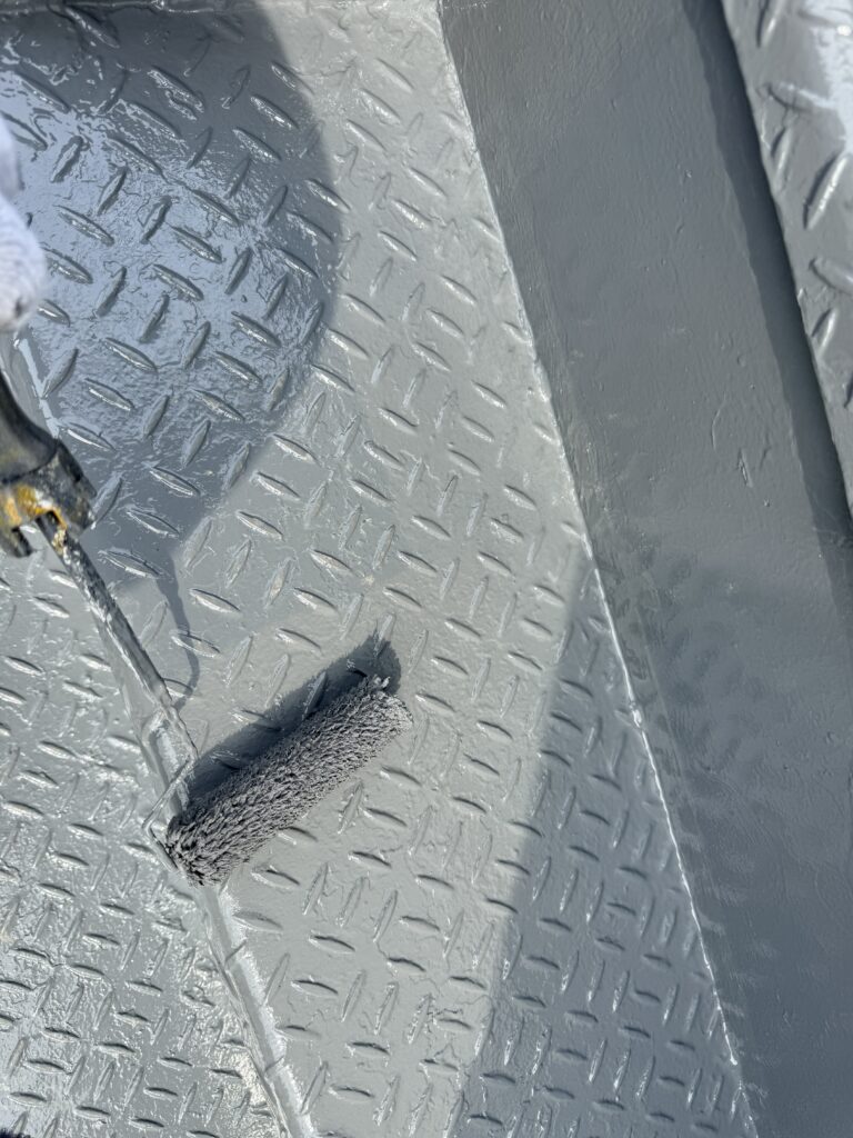 下地処理は電動・手動と併用して細部までしっかりとケレンを実施。錆の痛みが進んでいる箇所は先行して錆止めを塗り、その後全体をもう一度錆止めを塗ることで頑丈な下地を作りました。上塗りには弱溶剤2液シリコンを2回塗ることで耐久力のある塗膜を形成しました。